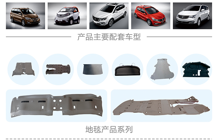 公司產(chǎn)品配套項(xiàng)目涵蓋轎車、MPV、SUV、新能源電動(dòng)車領(lǐng)域。公司主要參評(píng)有汽車頂棚、隔音墊、地毯、大型注塑件、橡膠制品、EPP泡沫等車內(nèi)飾品件。